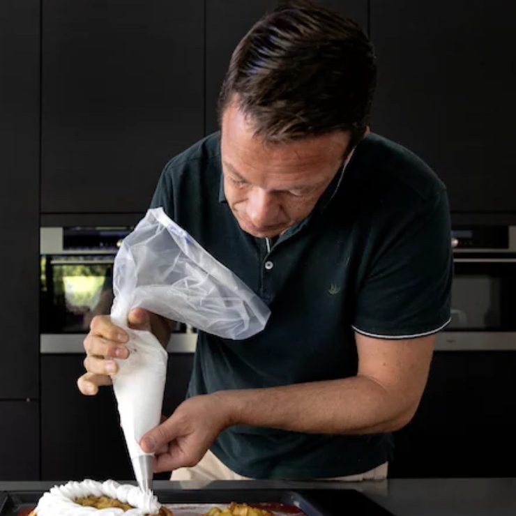 Zijn patisserie sluit naadloos aan bij onze manier van werken: ambachtelijk en altijd in balans. Bij Tafelmeesters verzorgt Tom de friandises als elegante afsluiting van het diner.